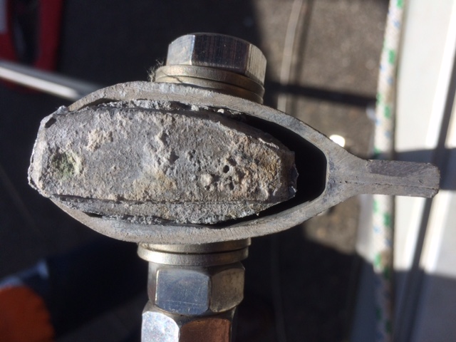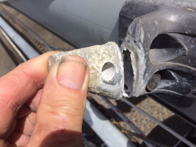 My plan is to have the fracture area built up with aluminium spot welding and then to weld on the broken off part. When the corroded area in the centre (I presume a cavity left untouched by the weld ) was scraped down, two holes were revealed ... purpose unknown.